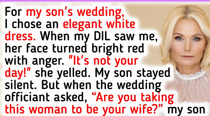 For my son’s wedding, I chose an elegant white dress. When my DIL saw me, her face turned bright red with anger. “It’s not your day!” she yelled. My son stayed silent. But when the wedding officiant asked, “Are you taking this woman to be your wife?” my son suddenly hesitated. Then, he looked at his bride, then at me, and took a deep breath.