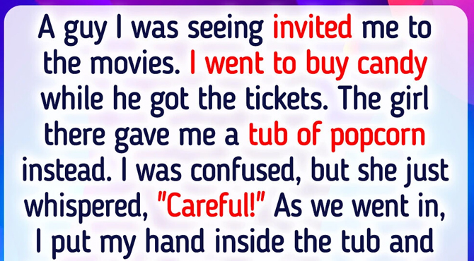 A guy I was seeing invited me to the movies. I went to buy candy while he got the tickets. The girl there gave me a tub of popcorn instead. I was confused, but she just whispered, “Careful!” She couldn’t say anything more, because the guy came, and we went into the theater.