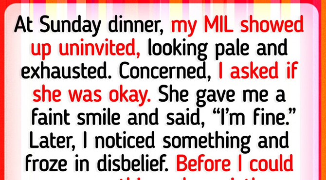 Sunday dinners at our house are sacred — full of laughter, good food, and just the right amount of family chaos. But last weekend, something felt off. My mother-in-law showed up uninvited, looking pale and exhausted. Concerned, I asked if she was okay. She gave me a faint smile and said, “I’m fine.”