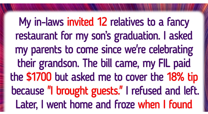 My in-laws invited 12 relatives to a fancy restaurant for my son’s graduation. I asked my parents to come too since we were celebrating their grandson. When the bill came, my father-in-law paid the $1700 and asked me to pay the 18% tip because “I brought guests.” I refused and left. My wife was quiet.