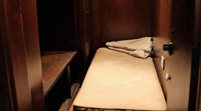 A tiny, windowless box with a narrow twin bed shoved against one wall and a small chest of drawers crammed against the other.