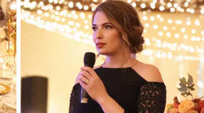 Simple navy dress, hair pinned back, eyes clear. She walked to the mic and said, “I loved Nathan.”