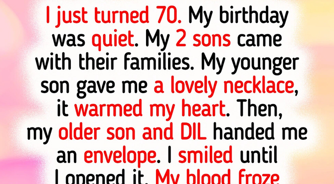 Anyway, my birthday was quiet this year. My younger son came with his family and gave me a beautiful necklace—I was genuinely touched. Then my older son and DIL handed me an envelope. I smiled… until I opened it.