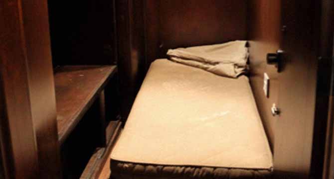 A tiny, windowless box with a narrow twin bed shoved against one wall and a small chest of drawers crammed against the other.