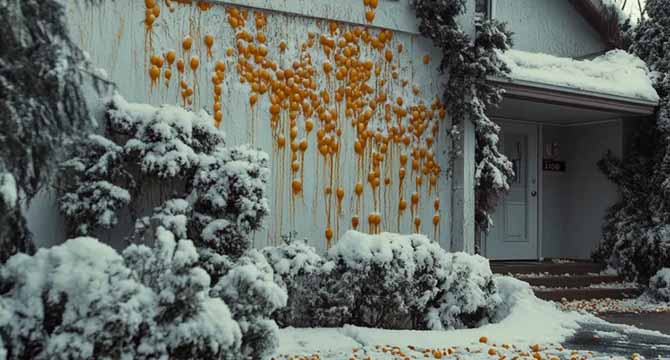 Raw eggs dripped from the walls in sticky streams, the porch was littered with broken shells, and even the holiday wreath I’d lovingly crafted was a splattered, smelly mess.