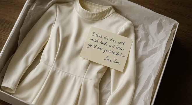 “I think this dress will match Neil’s suit better.You’ll look good beside him.Love, Lora.”