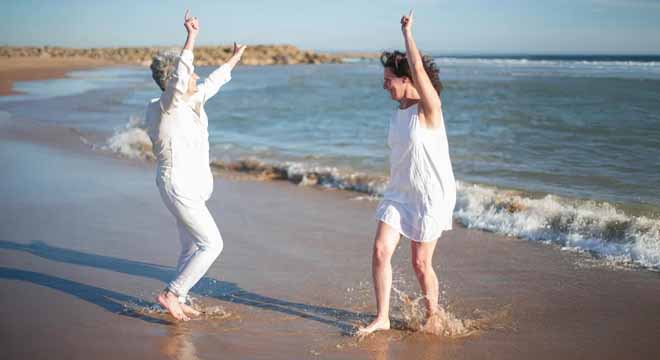 My MIL dancing on the seaside, looking like the happiest woman in the world. Next to her — Lora. Hair down, skin glowing. Both in white outfits. Couple look.