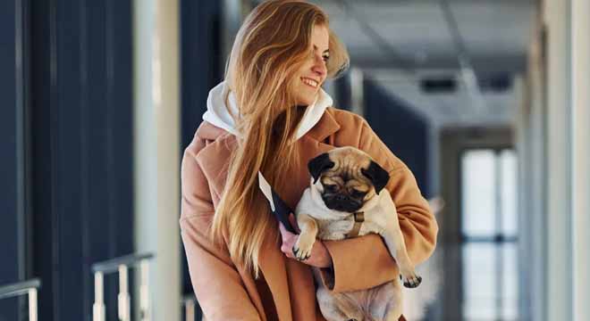 Behind her, a small white puffball of a dog was squatting — right in the middle of the terminal. Its rhinestone collar sparkled under the harsh airport lights.