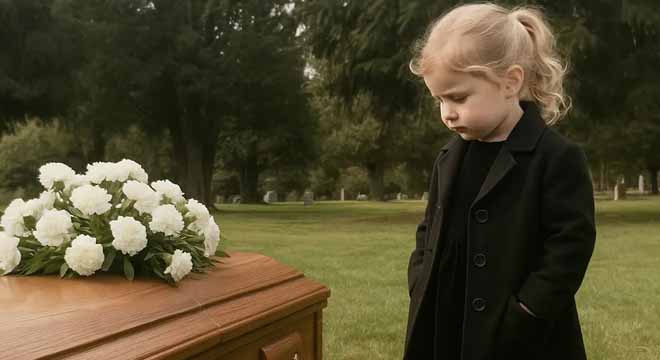 A little girl, around four years old and dressed in a black dress, stood by the grave, quietly crying.