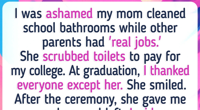 I was ashamed my mom cleaned school bathrooms while other parents had ’real jobs.’ She scrubbed toilets to pay for my college. At graduation, I thanked everyone except her. She smiled. After the ceremony, she gave me an envelope and left. Inside was a letter that said: “I’m proud of you. I never needed you to thank me publicly — I just needed you to succeed. But maybe someday you’ll understand what real work looks like.” Attached was her resignation letter from the school. She’d gotten hired as head of facilities management at my new company, meaning she’d be working in the same building as me. We have lunch together every Wednesday.
