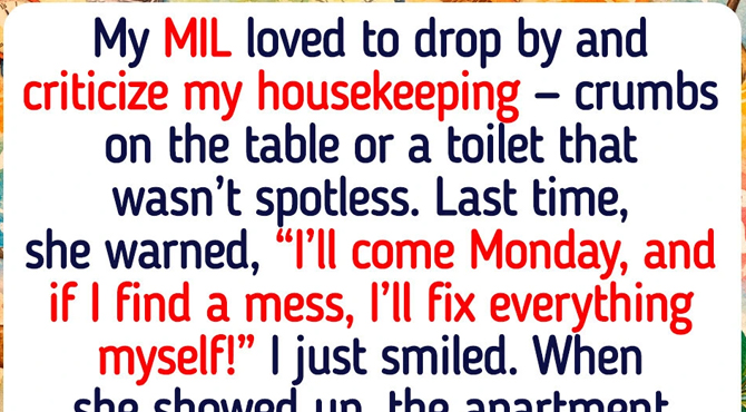My MIL loved to drop by and criticize my housekeeping — a few crumbs on the table or a toilet that wasn’t sparkling clean. Last time, she warned, “I’ll come on Monday, and if I find a mess, I’ll take charge and fix everything myself!” I took her threat seriously.