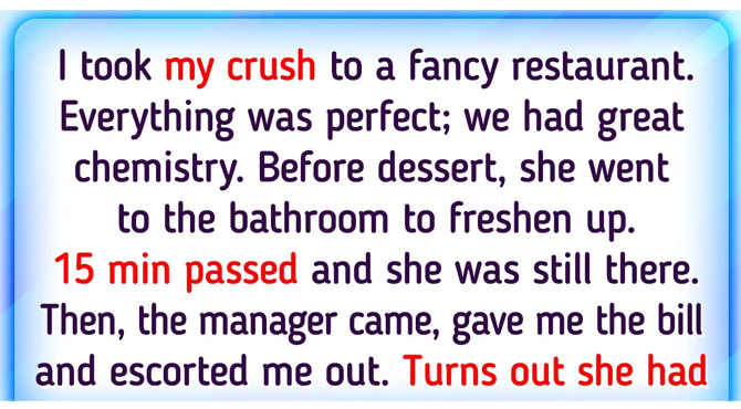 I took my crush to a fancy restaurant. Everything was perfect; we had great chemistry. Before dessert, she went to the bathroom to freshen up. 15 min passed and she was still there. Then, the manager came, gave me the bill and escorted me out.