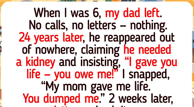Then, 24 years later, he suddenly reappeared, saying he needed a kidney. And as if that wasn’t shocking enough, he looked me in the eye and said, “I gave you life — you owe me.”
