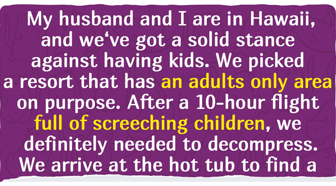My husband and I are in Hawaii, and we’ve got a solid stance against having kids. We picked a resort that has an adult area on purpose, with an 18+ only hot tub. Couldn’t find an adults-only resort within our budget. The rules are clear – there’s a giant sign that tells you this is for adults only. After a 10-hour flight full of screeching children, we definitely needed to decompress. We arrive at the hot tub to find a group of unattended children screaming and splashing around like a pack of wild hyenas, so we begrudgingly waited. The second day, we came downstairs as soon as the resort area opened….. to find a mom with a stroller blocking the path and a baby on her lap inside the hot tub. We got in regardless this time, and another couple joined us shortly after and they were clearly annoyed by this as well. Maybe I’m hyper-aware, but it seems like everywhere we go a crying child follows. Bar after 10-11 pm? You better believe, children. Adult-only areas? Children. Casino in Vegas? Loud, rated R movie? Believe it or not, children. Tattoo shops? They bring their children. And they complain “no one considers them.” When in reality, we have built a society that prioritizes them and we are forced to deal with the massive inconvenience and noise pollution, even in the very few spaces we are trying to have just for us.
