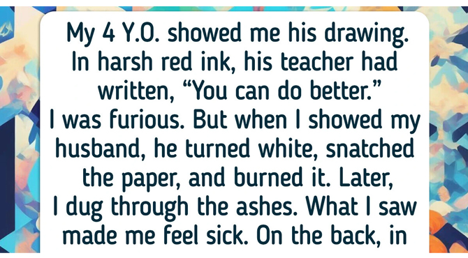 My 4 Y.O. showed me his drawing. In harsh red ink, her teacher, Miss A, had written, “You can do better.” I was furious. But when I showed my husband, he turned white, snatched the paper, and burned it. Later, I dug through the ashes. What I saw made me feel sick. On the back, in , in his handwriting: “Last night was a mistake. My wife is getting suspicious.” The late nights. The lies. It wasn’t work. It was her. And that note? It wasn’t for my child. It was for me. She wanted me to know. She wanted me gone. Fine. Divorce is already on the table.
