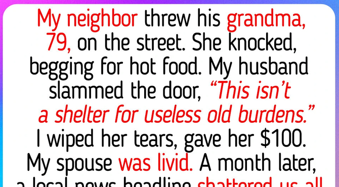 My neighbor threw his 79-year-old grandmother out of the house. That evening she knocked on our door, asking for something warm to eat. My husband didn’t hesitate: he opened the door just wide enough to say, “This isn’t a shelter for useless old burdens,” and slammed it in her face. She stood there crying, small and humiliated. I ran after her, wiped her tears, hugged her, and slipped her $100. She whispered something I couldn’t catch and walked away. My husband was furious. We fought. I told him, “Imagine if that was your mother. Would you want someone to shut the door on her?” He just shrugged. Cold. Detached. A month later, a local headline exploded through the neighborhood. The “useless old burden” had a name — Rosa. She had spent her entire life as a nurse at our hospital, staying late with patients no one visited: women after stillbirths, mothers abandoned with disabled newborns, people who had lost everything. To many of them, she became family.