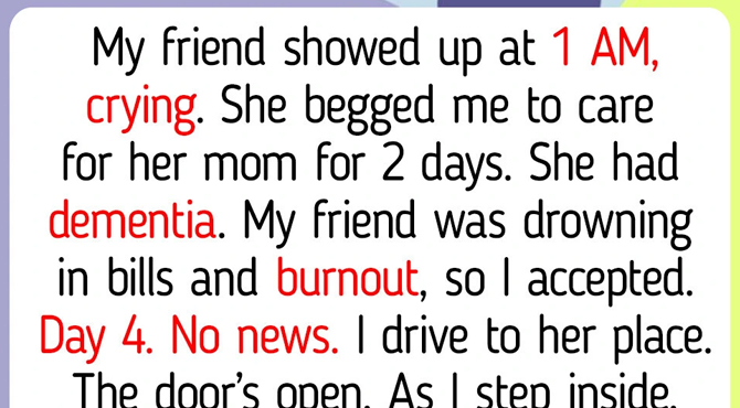 My friend showed up at 1AM, shaking. She begged me to care for her mom for 2 days. She had dementia. My friend was drowning in bills and burnout, so I accepted.