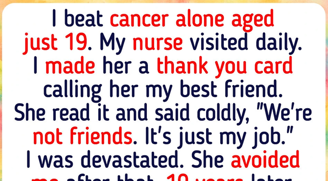 I beat cancer at 19, basically alone. This one nurse checked on me every day and she was honestly the only consistent person I had. So when I got discharged, I made her this cheesy thank-you card and even wrote something like “you’re my best friend” because, I don’t know, I was 19 and emotional and alive.