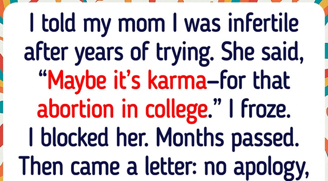 I was diagnosed with infertility after years of trying. It shattered me. I finally opened up to my mom, hoping for comfort. She said, “Well, maybe it’s karma for getting that abortion in college. Life has a way of teaching us lessons.”