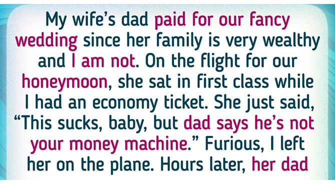 When we got on the plane for our honeymoon, she sat first class, and I realized my ticket was economy. She shrugged and said, “This sucks baby, but Dad says he’s not your money machine.” Furious, I left her on the plane.