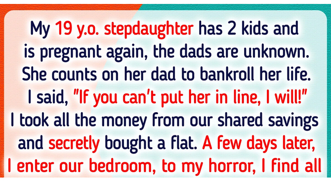 My 19 y.o. stepdaughter has 2 kids and is pregnant again, the dads are unknown. She counts on her dad to bankroll her life. I said, “If you can’t put her in line, I will!” I took all the money from our shared savings and secretly bought a flat.
