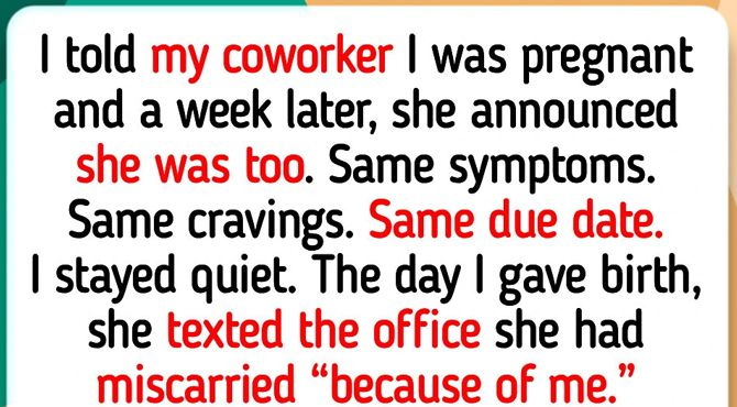 I told my coworker I was pregnant and a week later she announced she was too. Same symptoms, same cravings, same due date. I stayed quiet. The day I gave birth, she texted everyone she had miscarried because of me.
