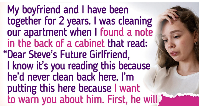 “My boyfriend Steve (30m) and I (28f) have been together for 2 years and have been living together for 8 months. I was cleaning our apartment when I found a note in the back of a cabinet that read:
