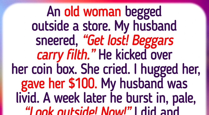 An old woman was begging outside a store. My husband sneered, “Get lost! Beggars carry filth,” and kicked over her coin box. She cried. I hugged her and gave her $100. My husband was furious.