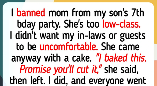 I banned my mom from my son’s 7th birthday party. She’s too low-class. I didn’t want my in-laws or guests to be uncomfortable. She came anyway with a cake. “I baked this. Promise you’ll cut it,” she said, then left.