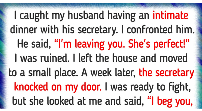 I caught my husband having an intimate dinner with his secretary. I confronted him. He said, “I’m leaving you. She’s perfect!” I was ruined. I left the house and moved to a small place.