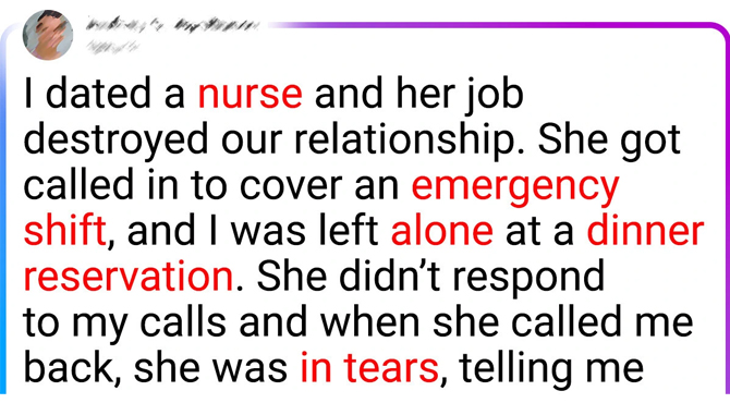 I dated a nurse and her job destroyed our relationship. She got called in to cover an emergency shift, and I was left alone at a dinner reservation. She didn’t respond to my calls. And when she finally called me back, she was in tears, telling me she’d lost a patient.
