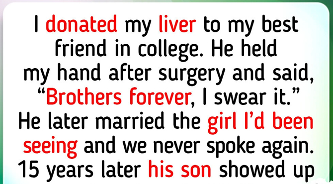 I donated part of my liver to my best friend in college. He held my hand after surgery and said, “Brothers forever, I swear it.” He later married the girl I’d been seeing and we never spoke again. 15 years later, his son showed up at my door. I went still…