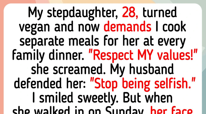 My stepdaughter, 28, turned vegan and now demands I cook separate meals for her at every family dinner. “Respect MY values!” she screamed last week. My husband defended her and said, “Stop being selfish.” I smiled sweetly and kept quiet.