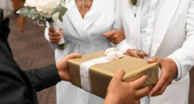 The gift was brought out during the reception and placed on a table near the cake.