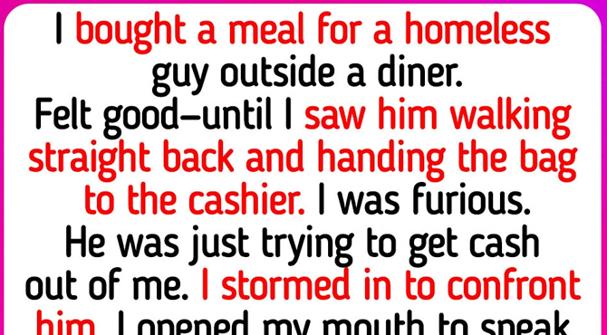 I bought a massive meal for a guy outside a diner who looked like he hadn’t eaten in days. I felt good about it until I saw him walk right back inside. Through the window, I watched him hand the bag back to the cashier.